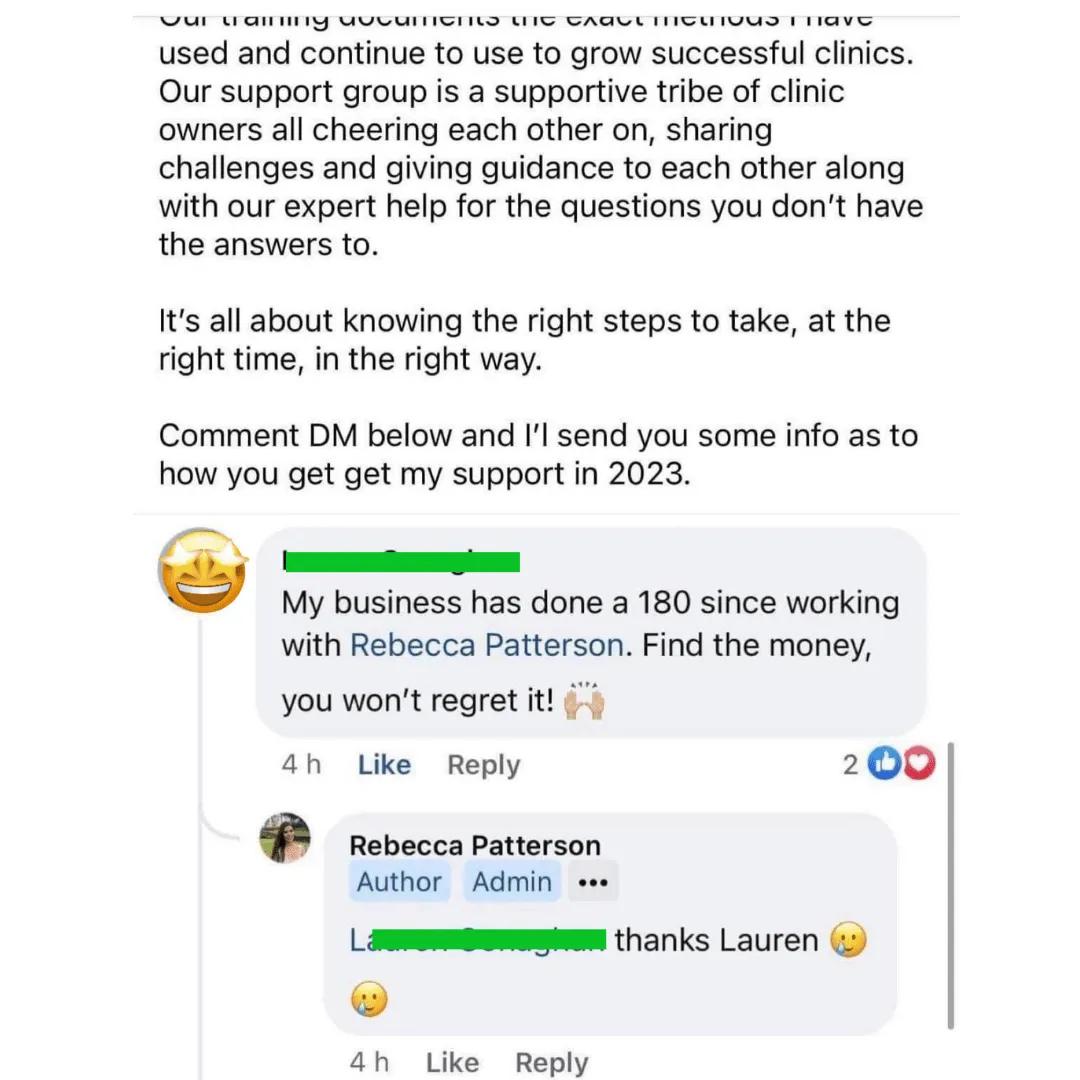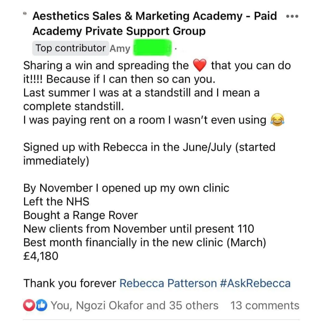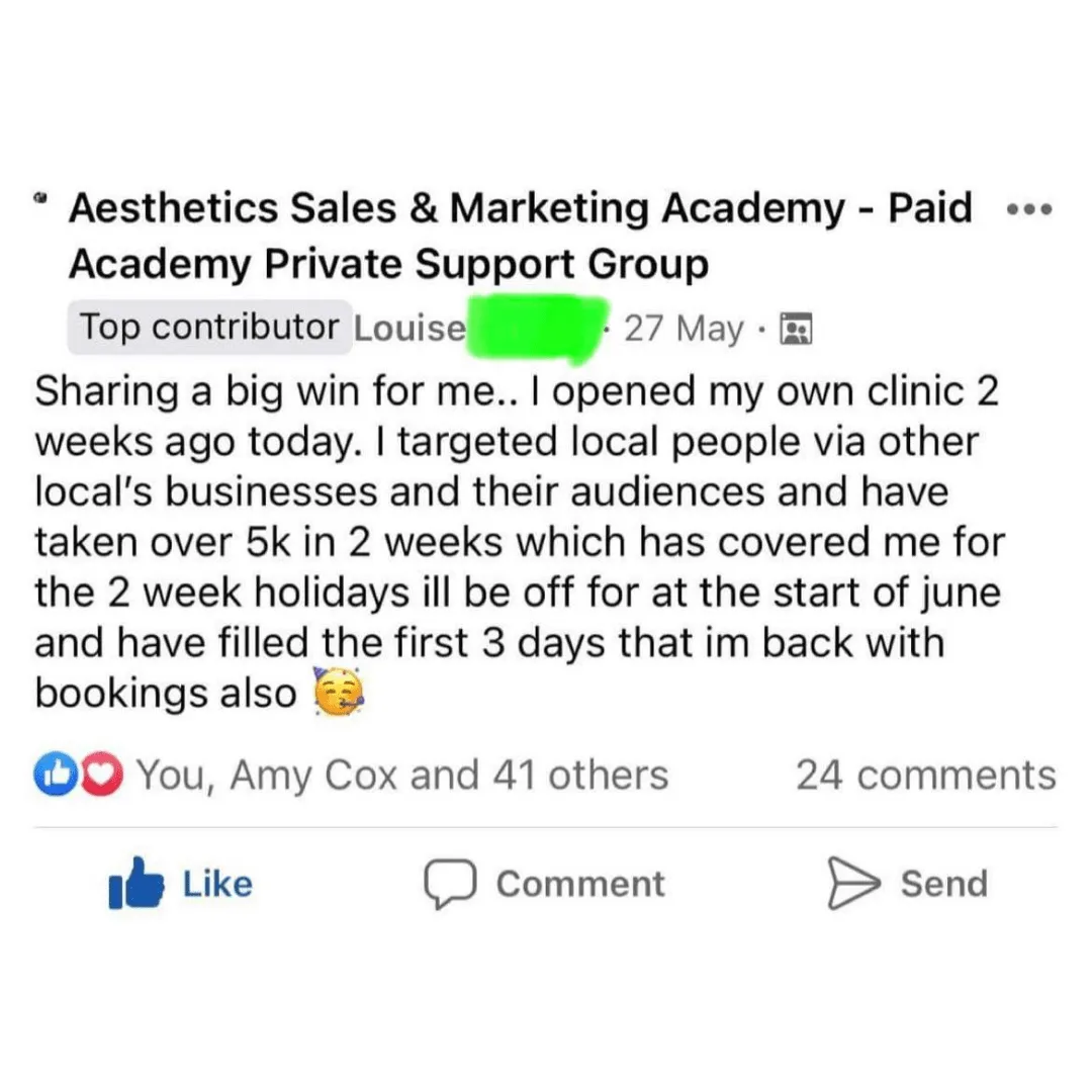 By joining the Aesthetics Marketing Academy Facebook group, aesthetics professionals get access to an online mastermind of likeminded practitioners who can get all their business related questions answered